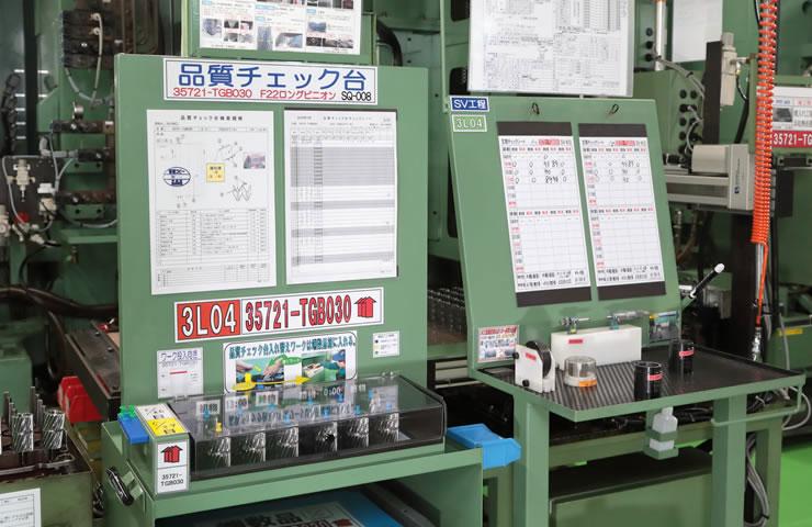 In addition to change control, workers and setup personnel regularly inspect and measure the sample inspection items specified for each process, and checks are also conducted by off-line inspectors at the "quality check stand."