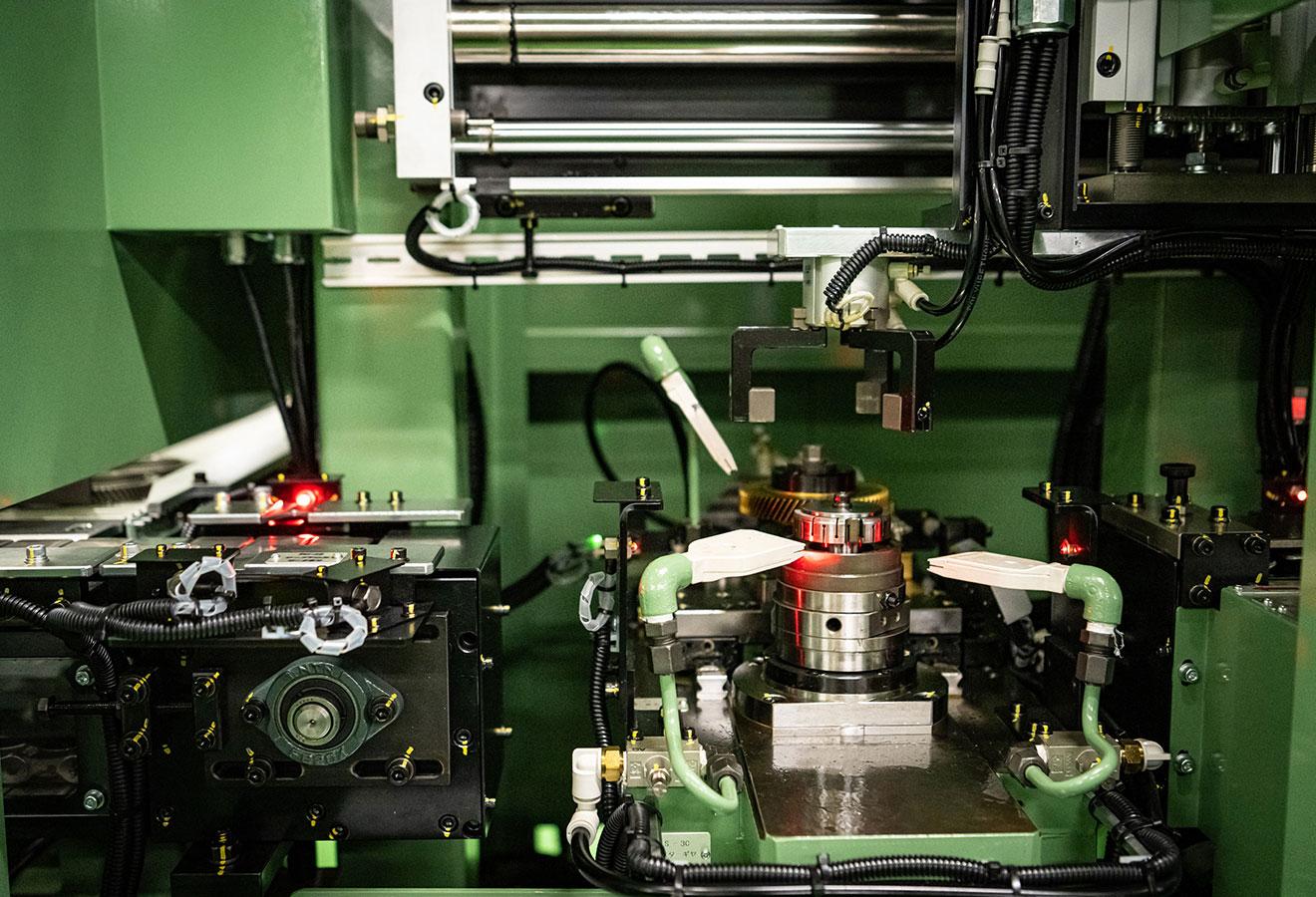 当社の自動生産ラインでは、寸法の自動補正を行なうための自動計測装置や未加工や外観不良品の流出を防止する画像処理装置及び様々なポカヨケが装備されています。また、ピニオンギヤの生産ラインでは噛合い検査を行なうギヤチェッカーが設置されています。
